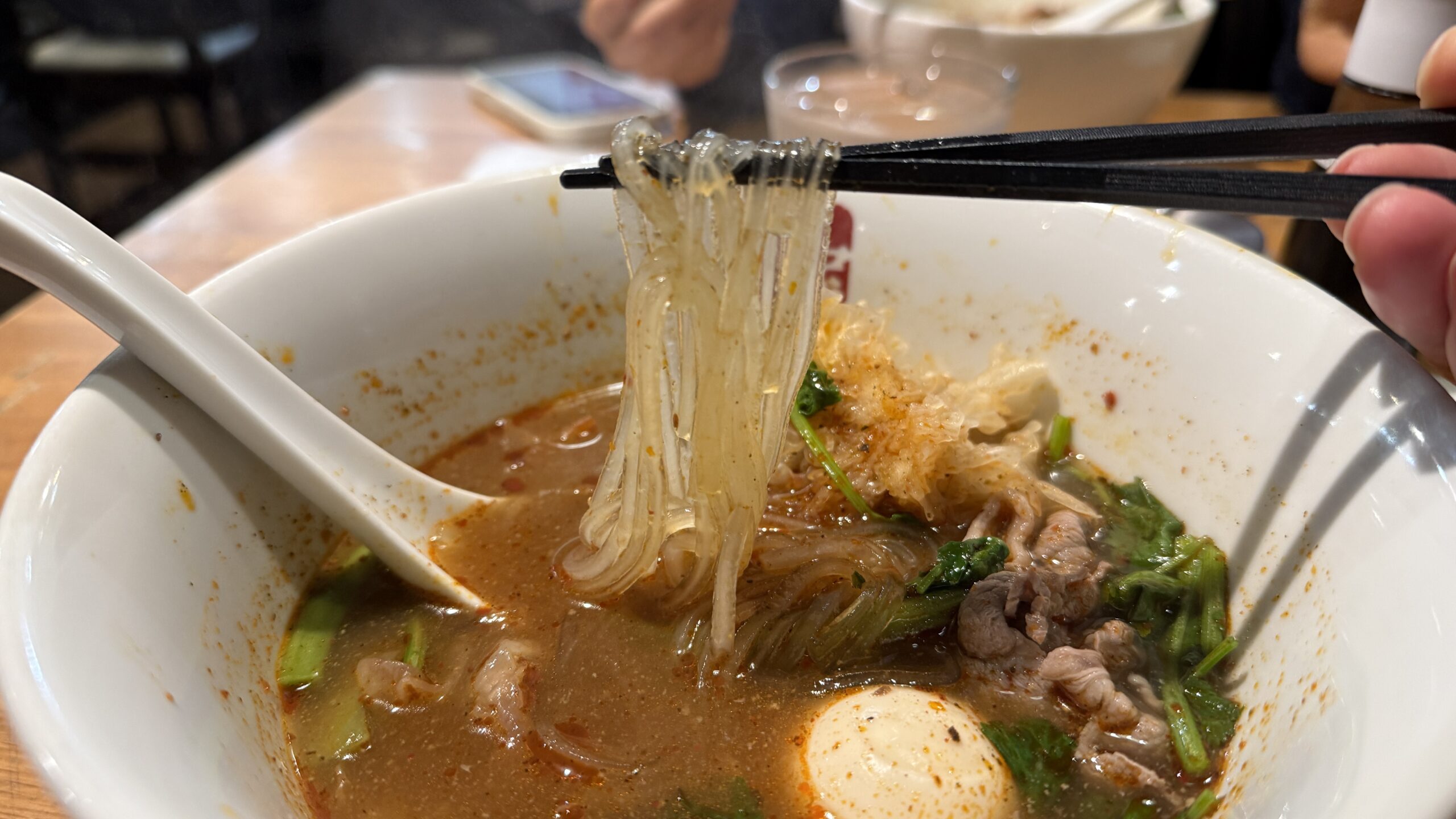 スープは極薬膳に変更し(150円)、辛さは3(大辛)、春雨は細麺でお願いしました。