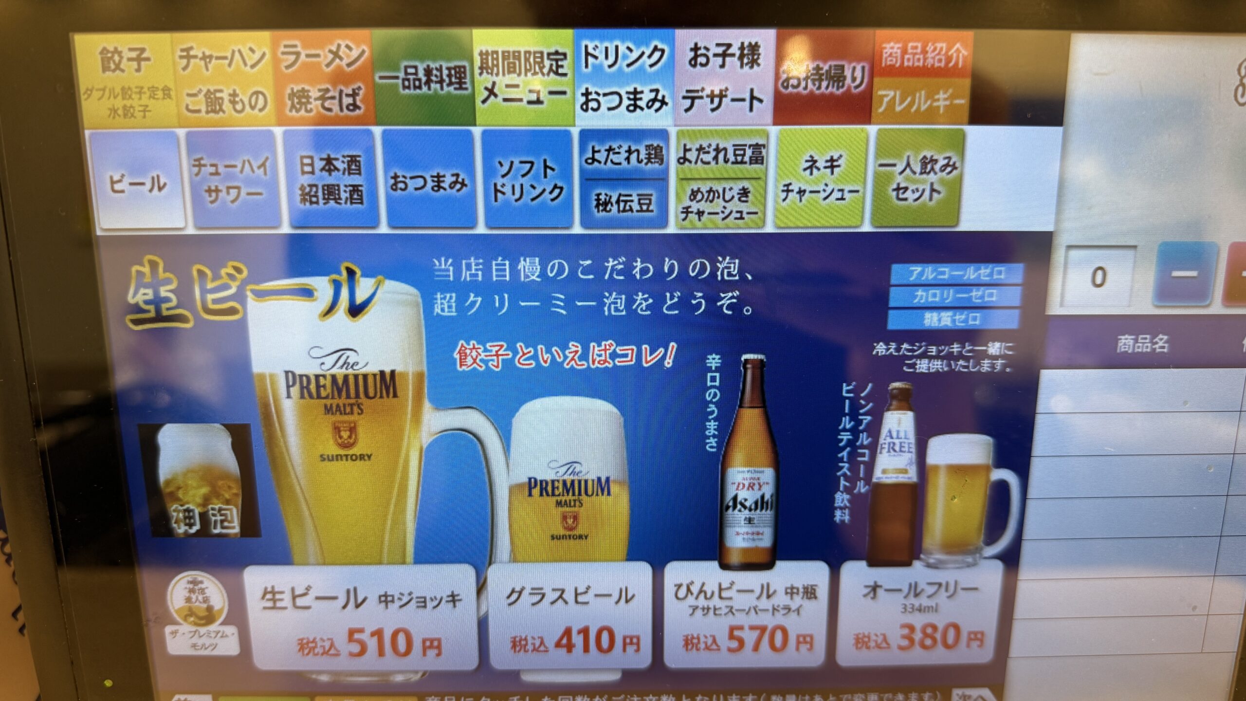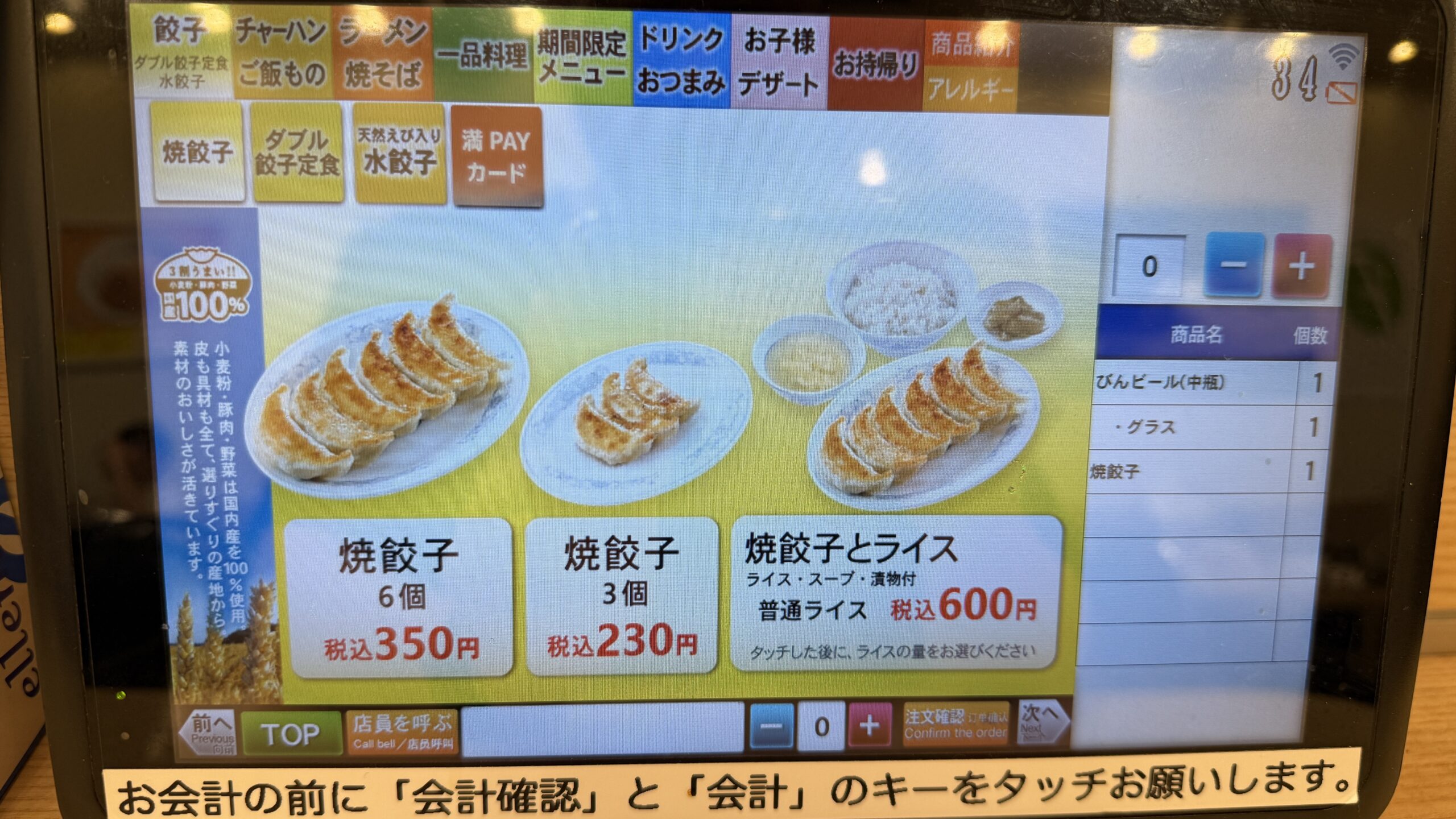 やや到着時間長めなので、間につまめるようなスピードメニューを注文するか、餃子到着後にビールを注文した方が良かったかもしれません。