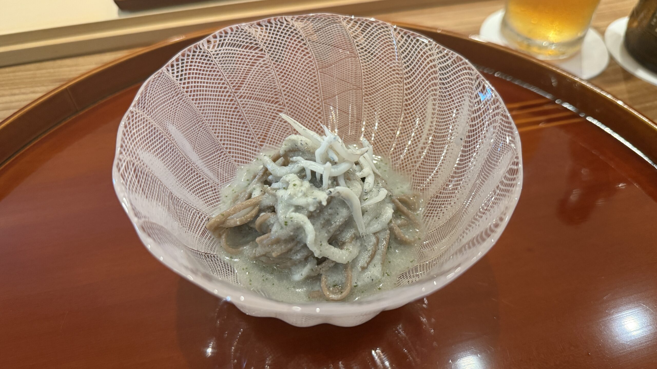 和歌山県産のしらすと木の芽を潰したソース、そこに蕎麦を合わせています。