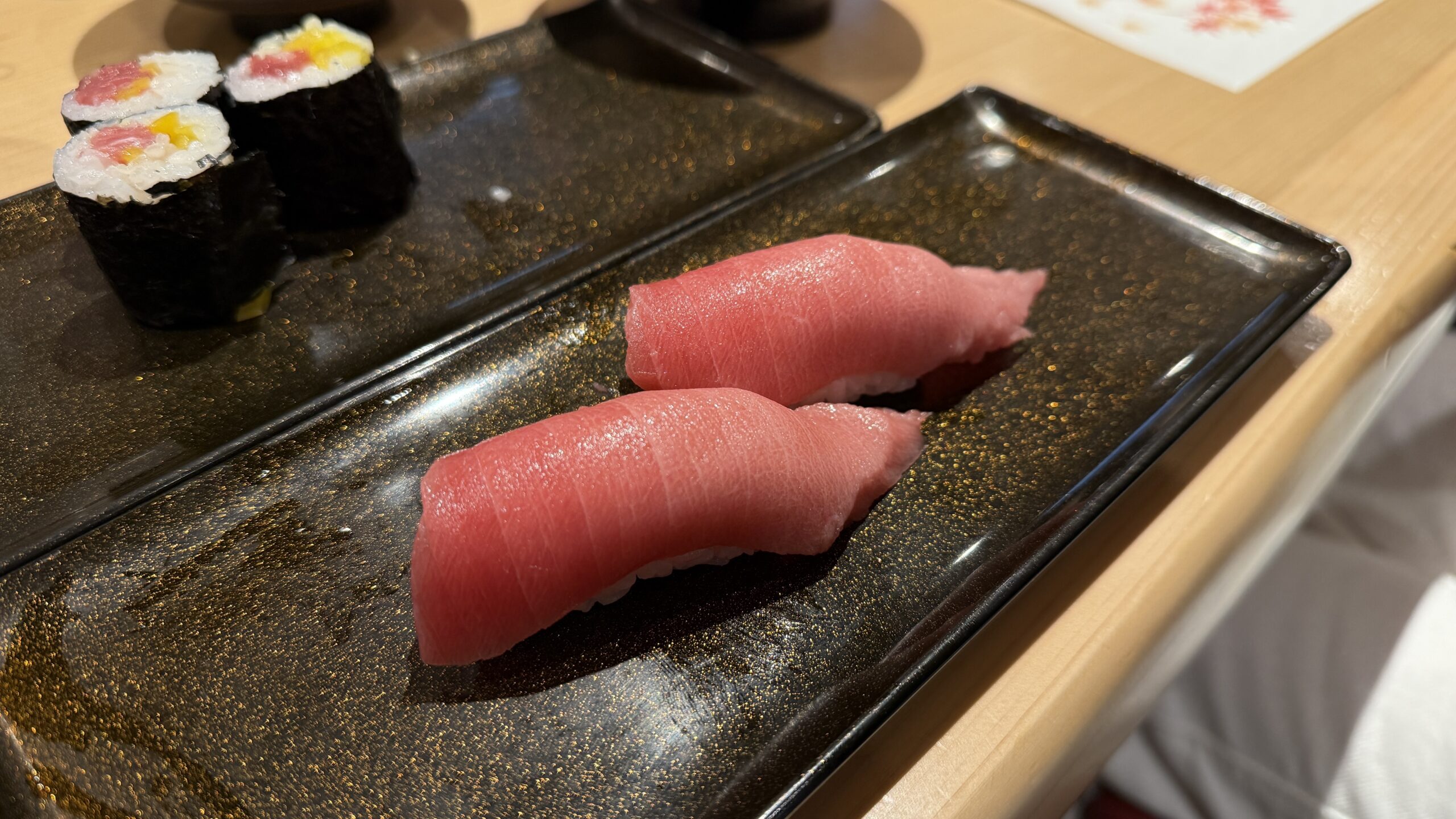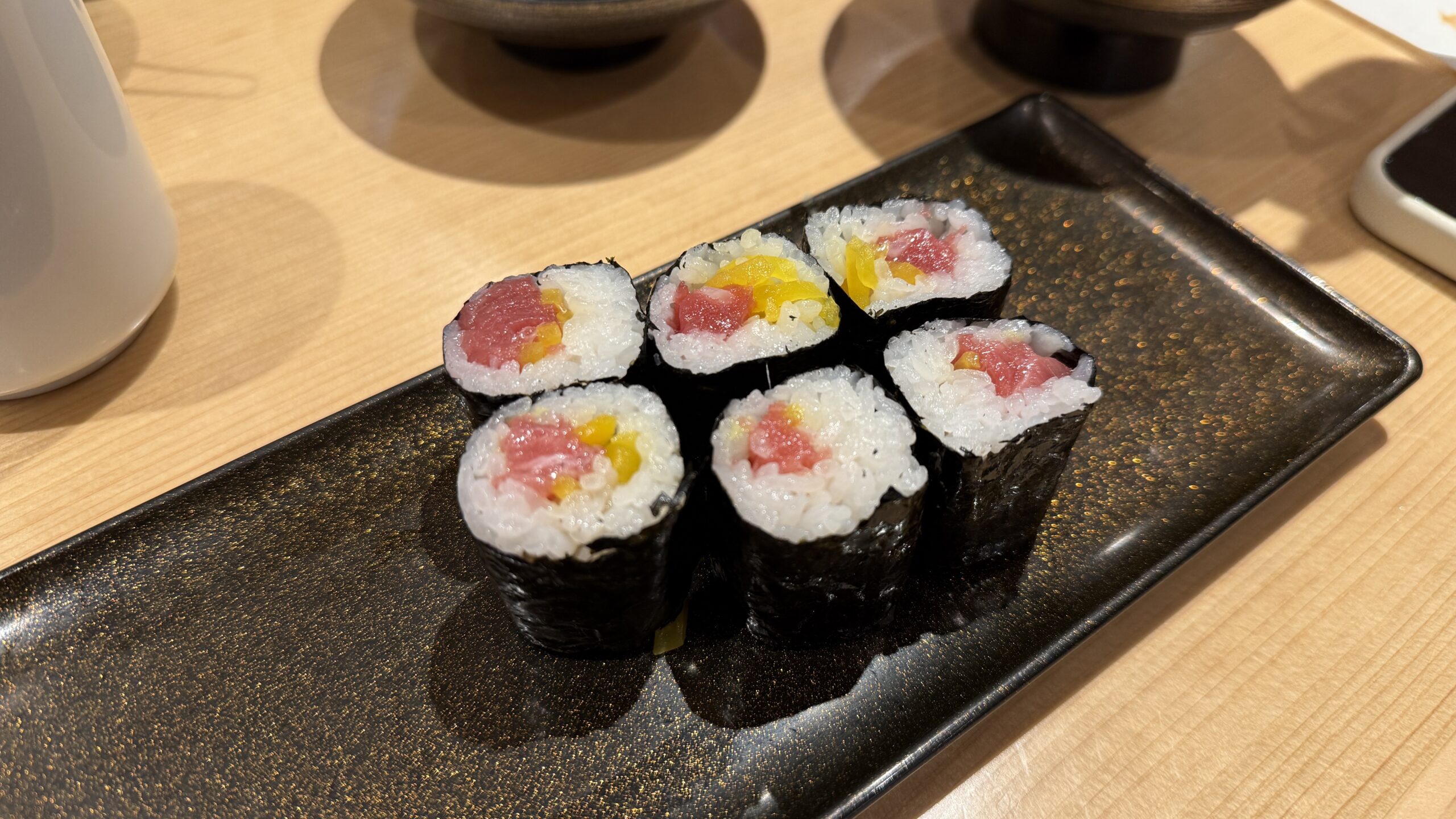 シャリと海苔に負けないほど脂を感じつつ、たくあんの食感と塩味が印象に残ります。