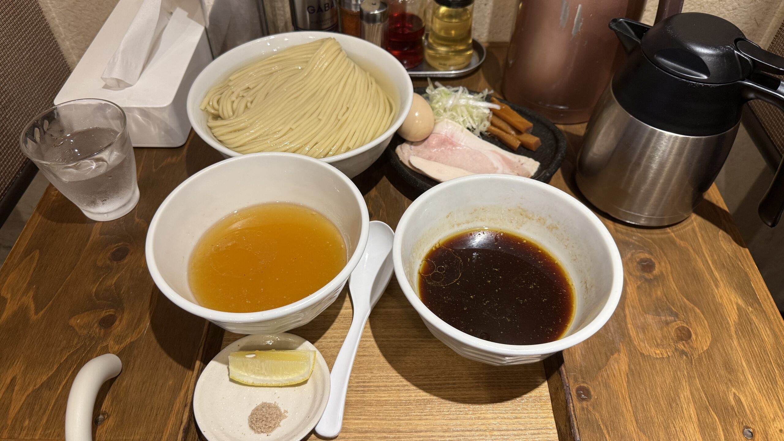 トータルでは『つけ麺300g(1,500円)+麺100g増量(200円)×2+味玉(150円)+藻塩+レモン(50円)』で2,100円、ここに予約手数料700円がかかりますので、合計2,800円でした。