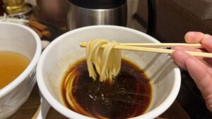 麺をつけて頂いていきますが、醤油がビシッと効いていて鶏の旨味が香りますので、牡蠣油よりもこちらの方がつけ汁としては合っているかと思います。