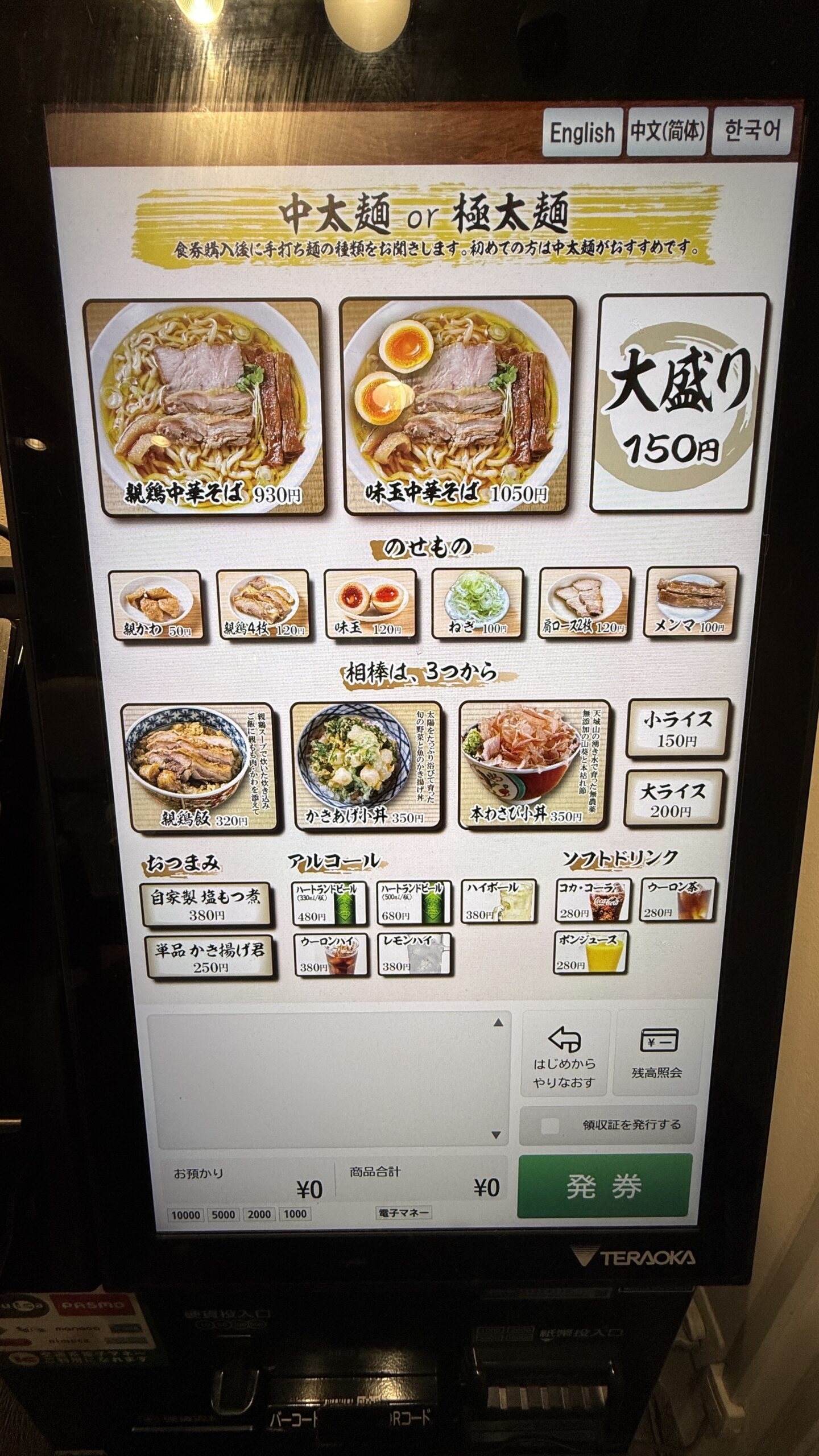 今回は『味玉中華そば(1,050円)』と『親鶏飯(320円)』を選択しました。