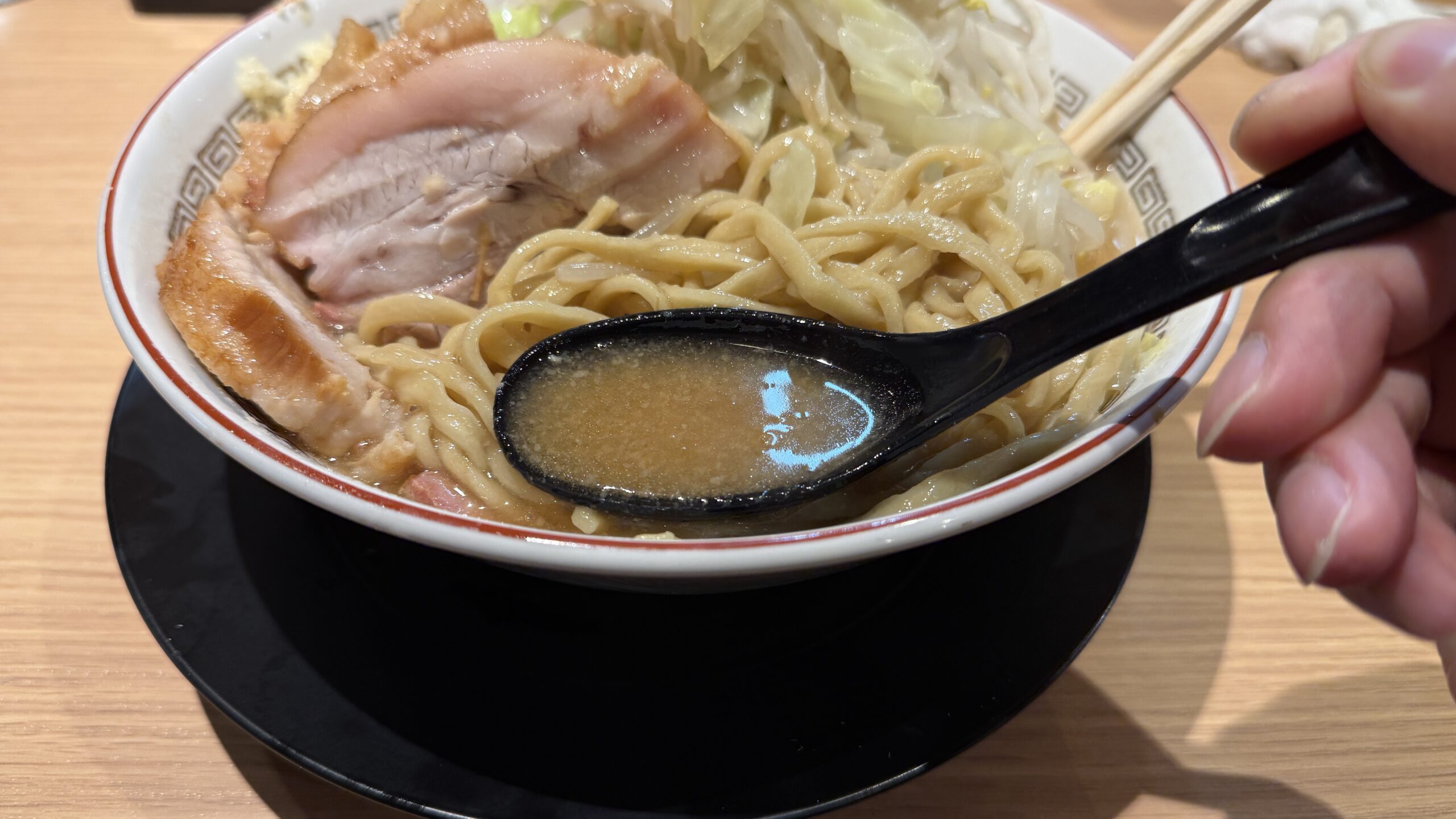 この日は豚感が強くスープに出ていて、直系二郎を彷彿とさせるような味わいがありました。