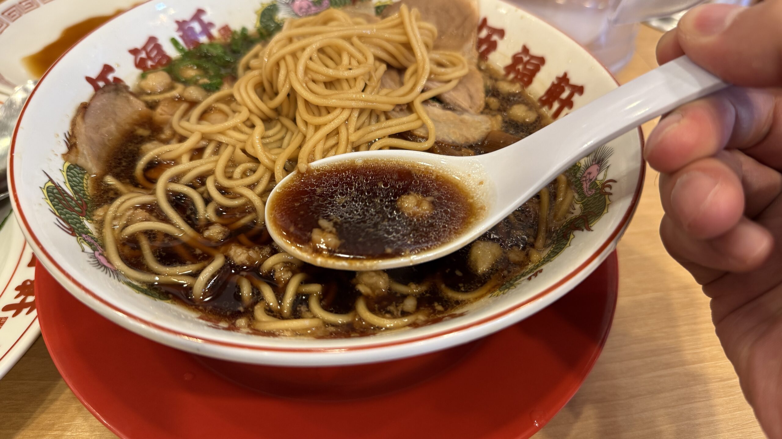 背脂がそこそこ入っており、漆黒のスープが特徴的な見た目です。