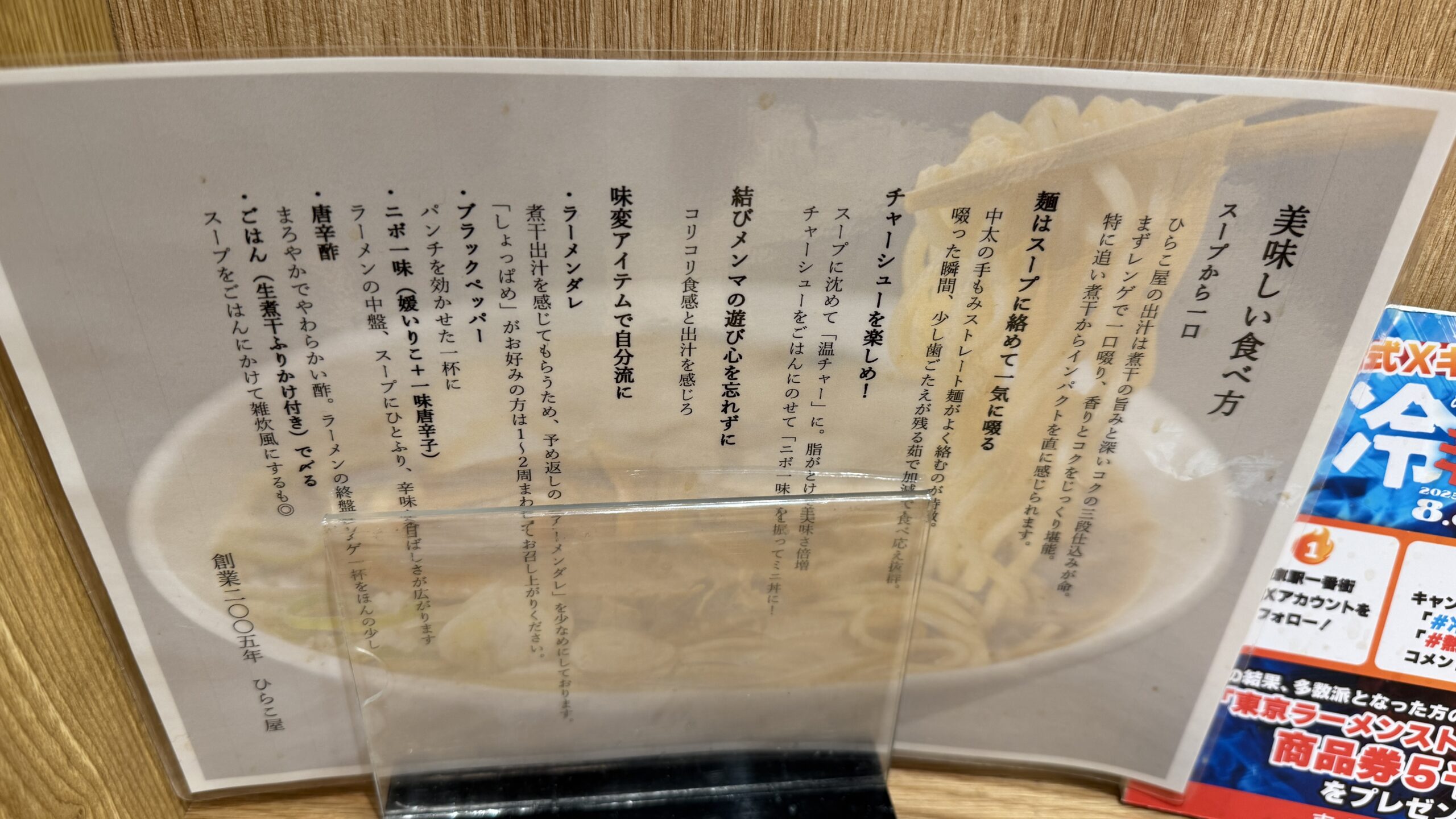 また、卓上の掲示物に煮干しを感じてほしいのであえて塩分を控えめにしていると記載がありますが、普通はこんなの読まないよなと。。
