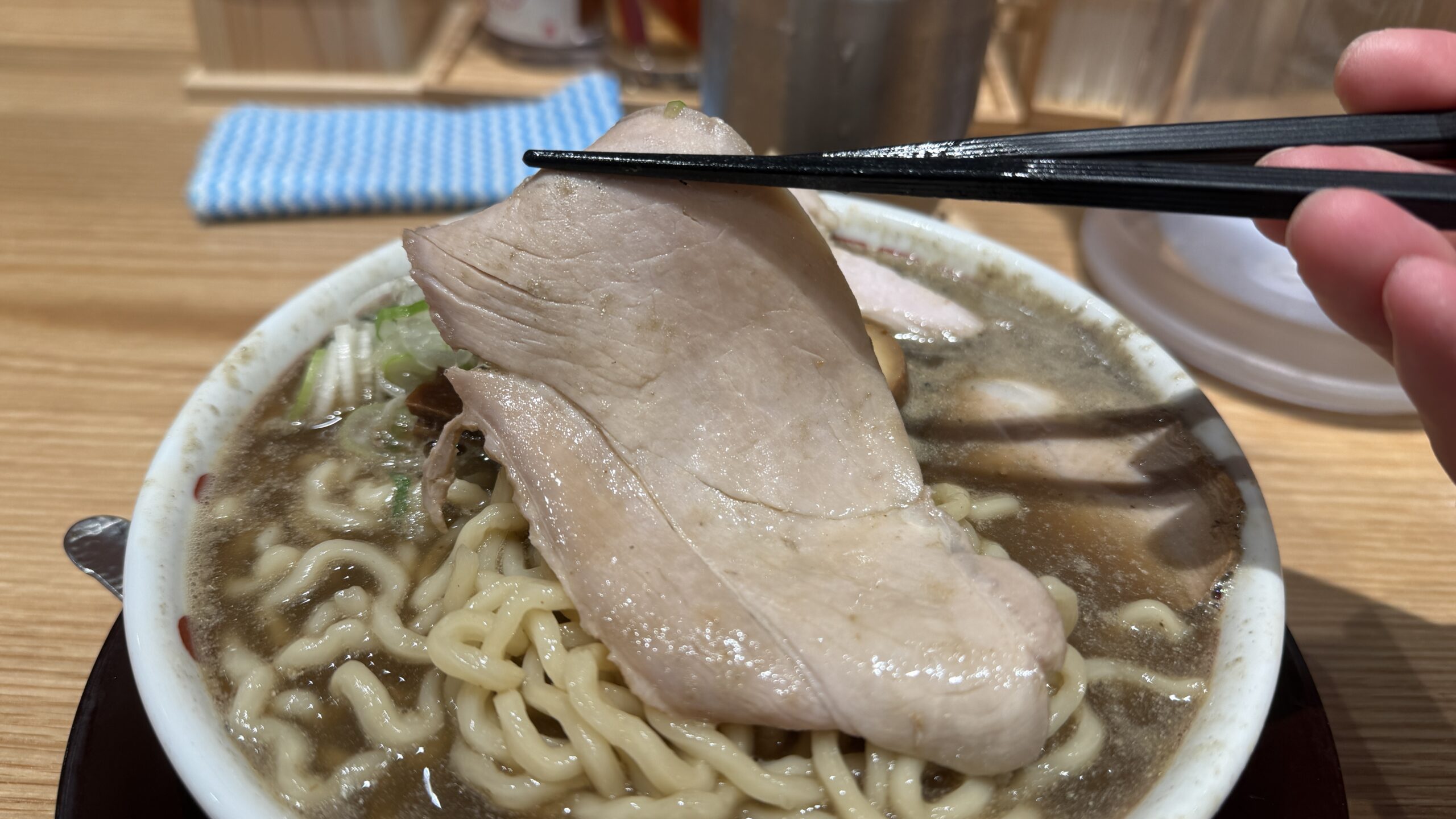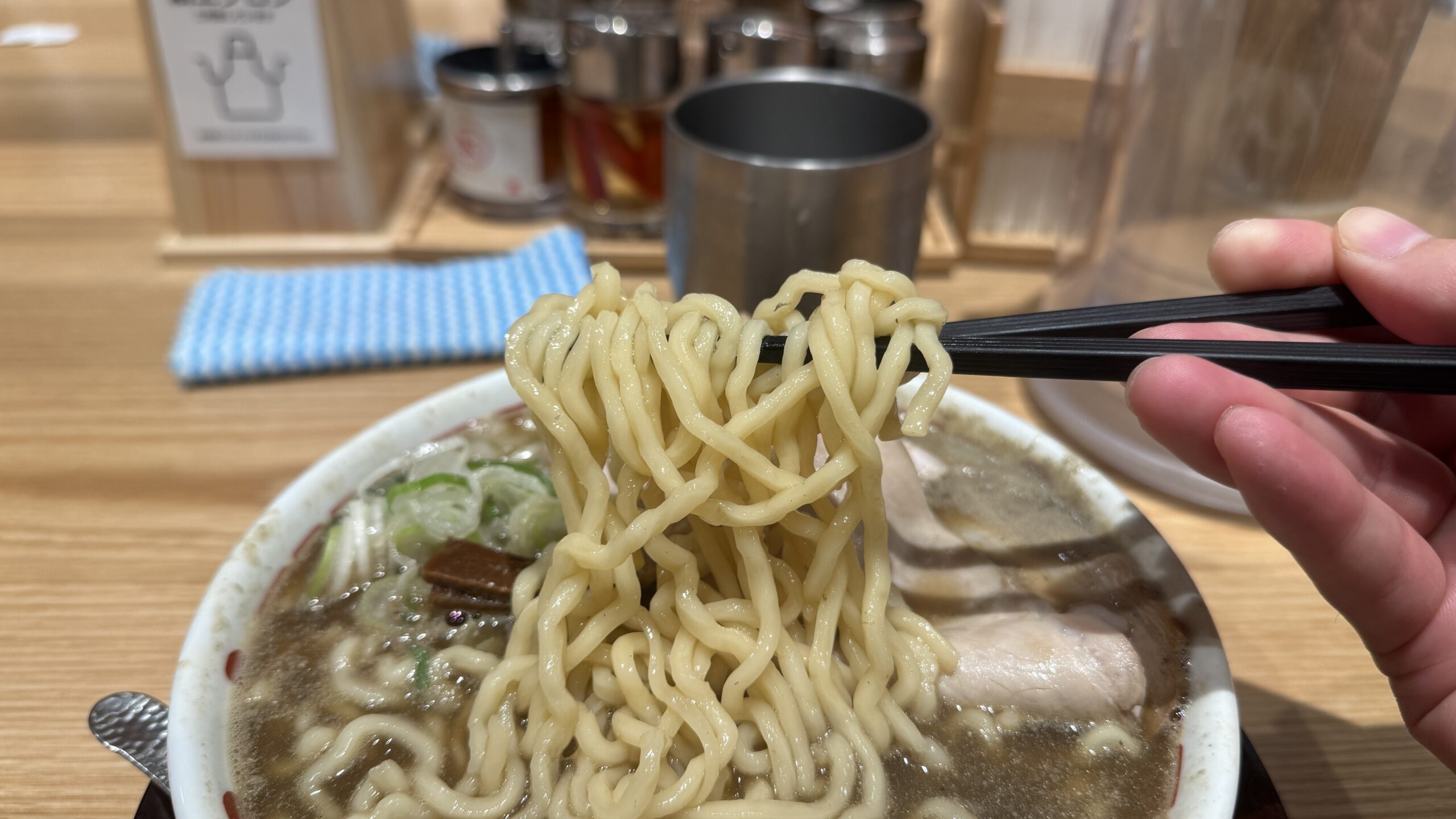 前回はこの表面のツルツル具合によってスープとの絡み具合は弱めに感じましたが、柔らかめの茹で加減の影響かこの日はマッチしている印象を受けました。