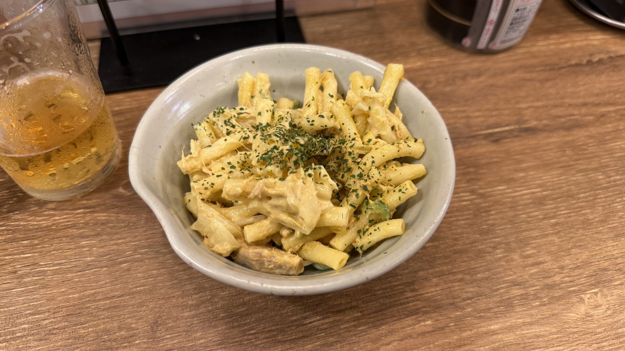 おつまみ1品目は『カレーマカロニサラダ(税別190円)』です。