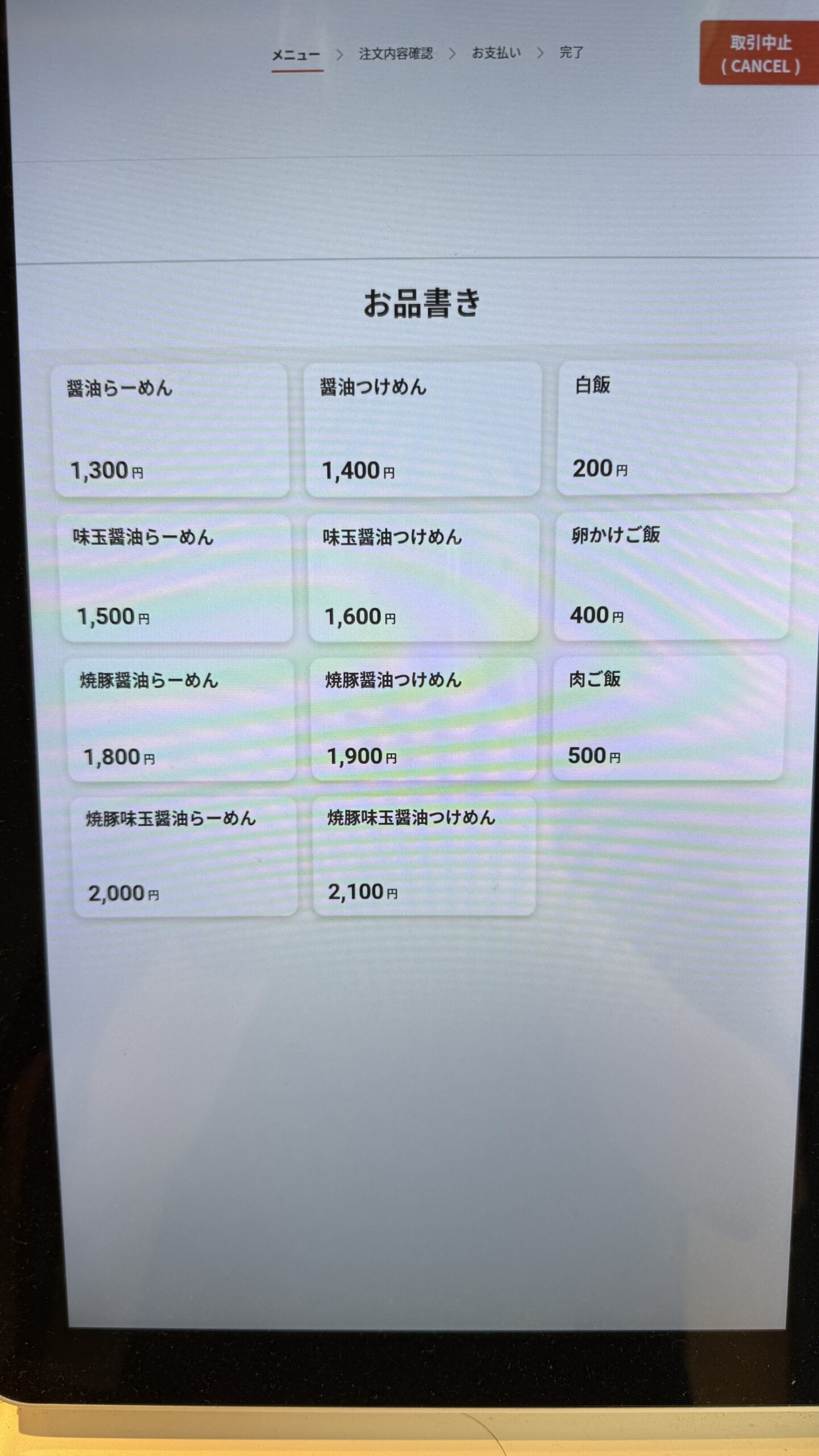 メニューは醤油らーめんか醤油つけめんにトッピングをどうするかです。