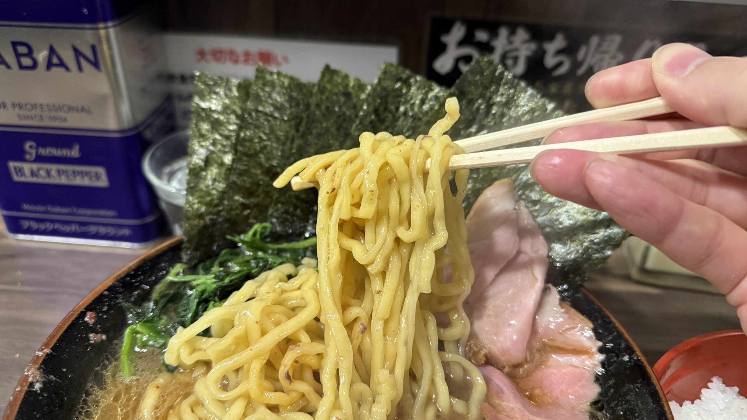 家系と言えばの酒井製麺ではなく、三河屋製麺の中太縮れ麺です。