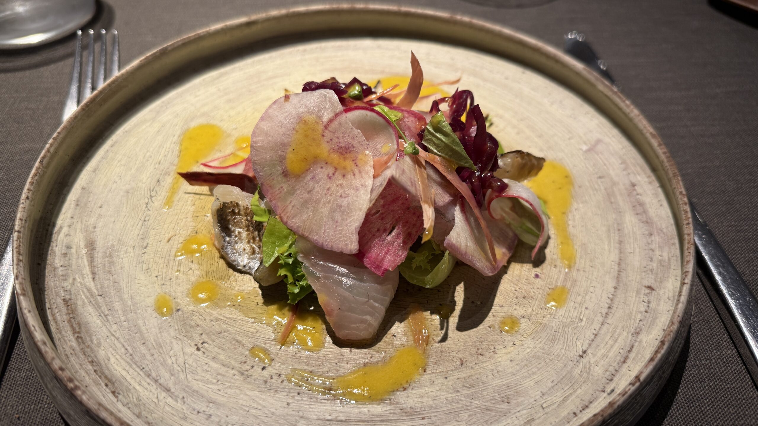 カンパチ、太刀魚がサラダ風のカルパッチョに仕上げられています。