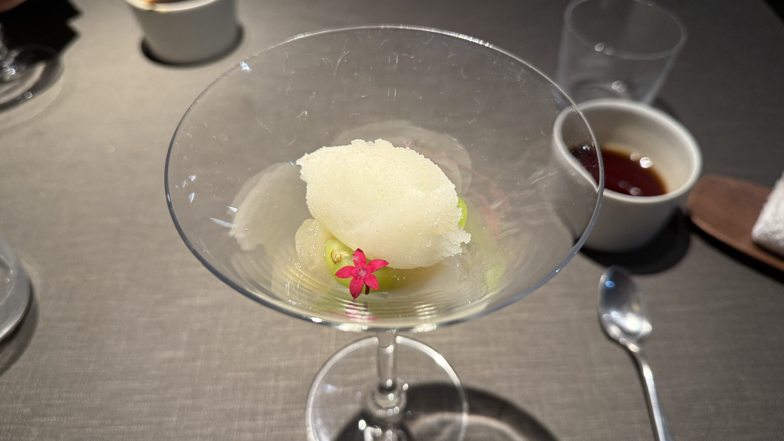 梨のシャーベットに、ヨーグルトのムース、シャインマスカットが下に敷かれています。