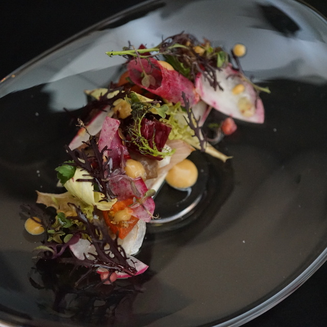 金目鯛にナスのパウダー、ピューレ、ソース。