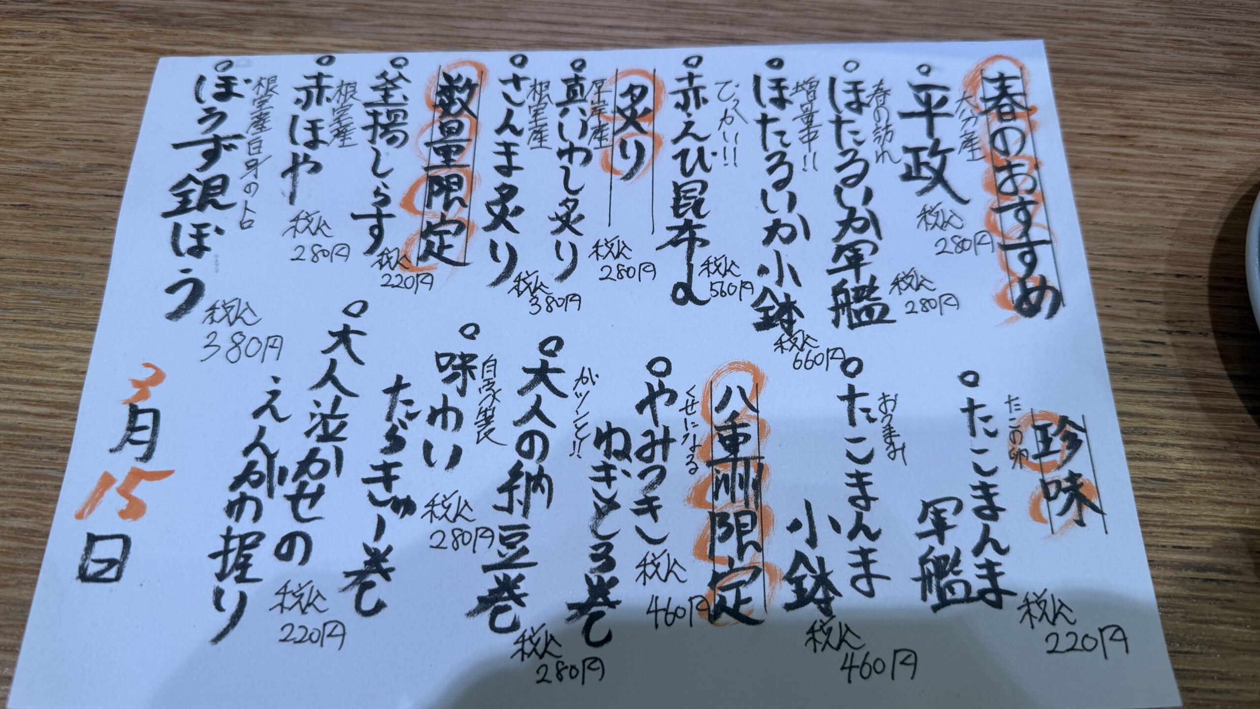 その日のおすすめや限定メニューは手書き風のメニューに記載があります。
