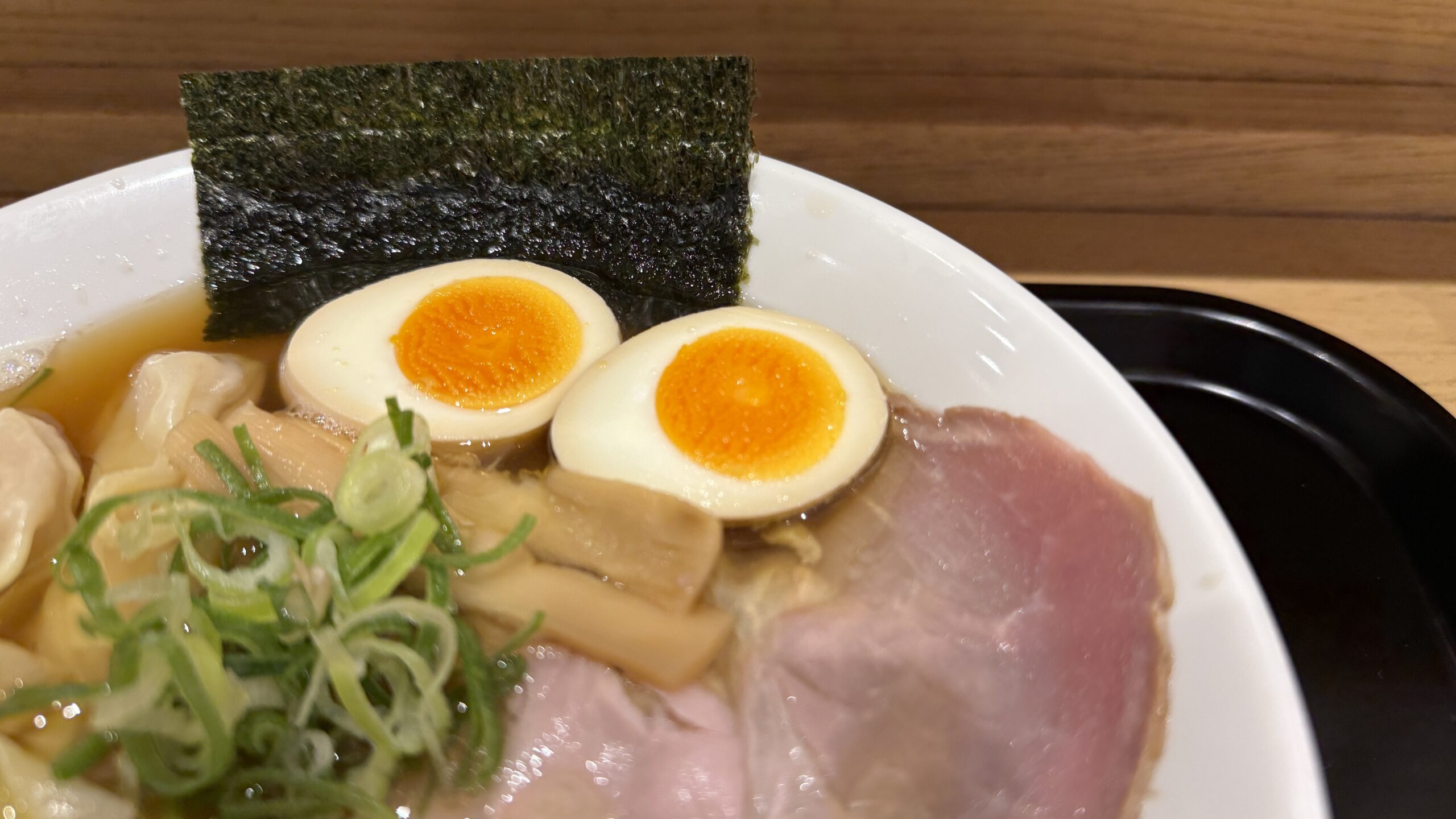 デフォルトの醤油らぁめんもありますが、店名にわんたんめんと付いていますので、今回はワンタン入りを選択しました。