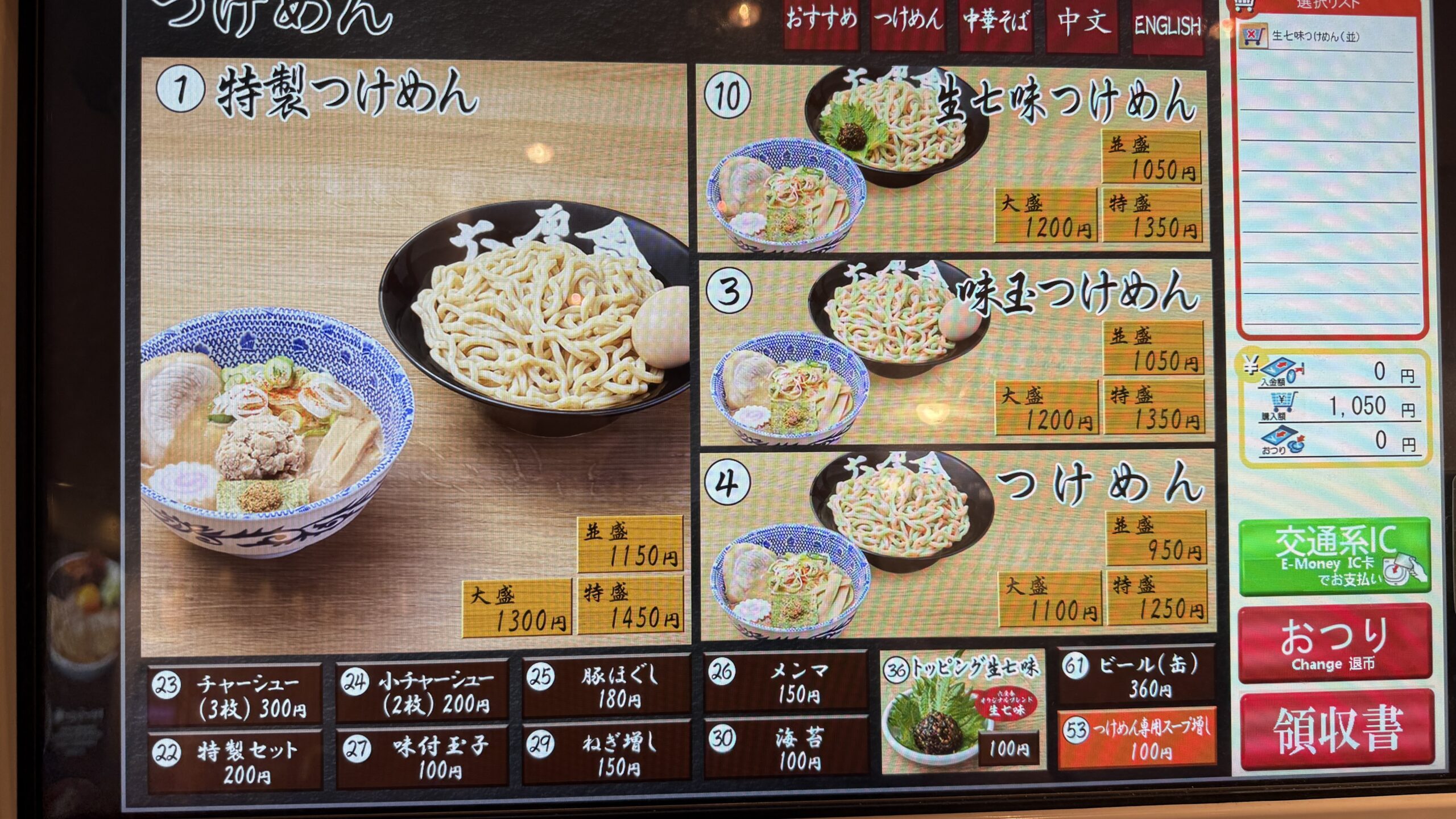 今回は『生七味つけめん(1,050円)』を選択しました。